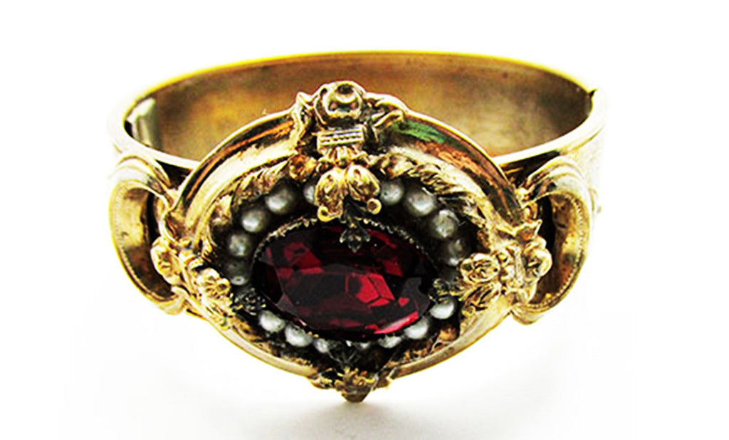 Antique Edwardian 1910s Ruby Rhinestone and Pearl Gold Cuff Bracelet - Centerpiece