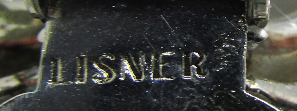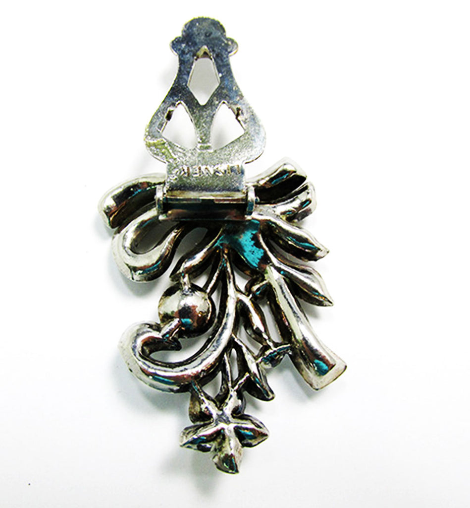This sophisticated 1930s Lisner designer dress clip showcases refined Art Deco elegance with a delicate floral design accented by sparkling clear and aquamarine rhinestones in a silver-toned setting. Measuring 1-1/2 by 1-1/4 inches, it features a beautifully engraved mechanism that speaks to its high-end craftsmanship. Signed Lisner in block letters, this versatile vintage piece can effortlessly enhance a collar, neckline, pocket, or lapel. Pristine and unique, it’s an exceptional accessory for the discerning fashionista seeking both originality and timeless quality.