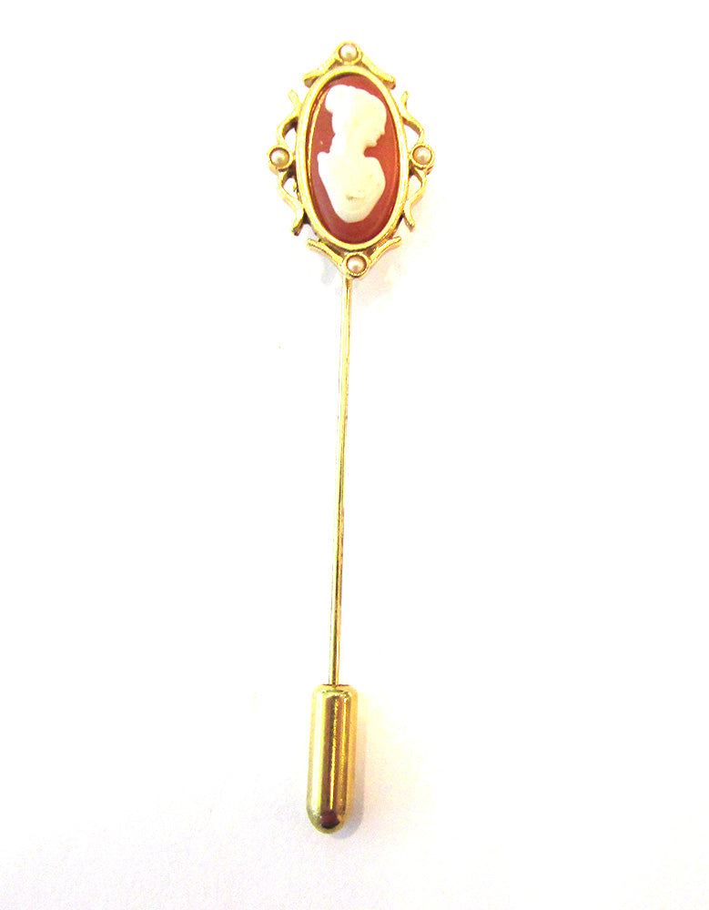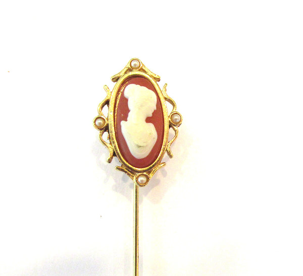 Signed Avon 1960s costume jewelry. Eye-catching mid-century cameo and pearl hat or stick pin. Piece contains ivory faux pearls and a cameo of a woman’s head on a faux carnelian background in a gold tone setting.