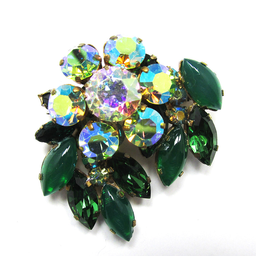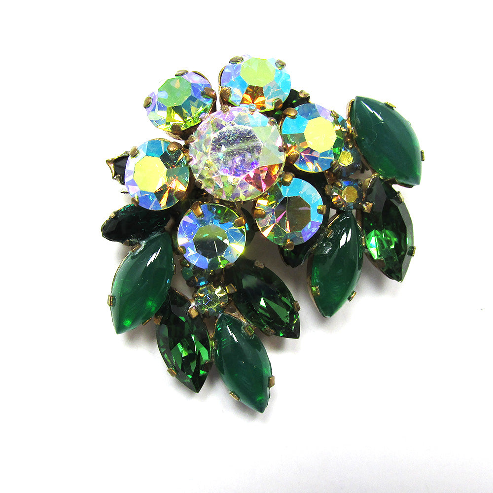 Elevate your style with this stunning vintage mid-century floral pin. Featuring sparkling emerald green and iridescent aurora borealis rhinestones in a gold toned setting, this 1950s piece is signed Austria and crafted with impeccable design and quality. Measuring 2 inches x 2 inches with a secure roll-over safety closure, it's the perfect addition to your collection or a thoughtful gift for a loved one. Don't miss out on this collectible pristine and timeless treasure!