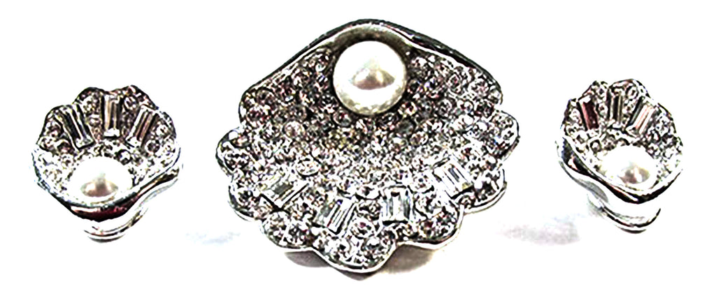 Vintage 1960s Clear Rhinestone and Pearl Seashell Pin and Earrings