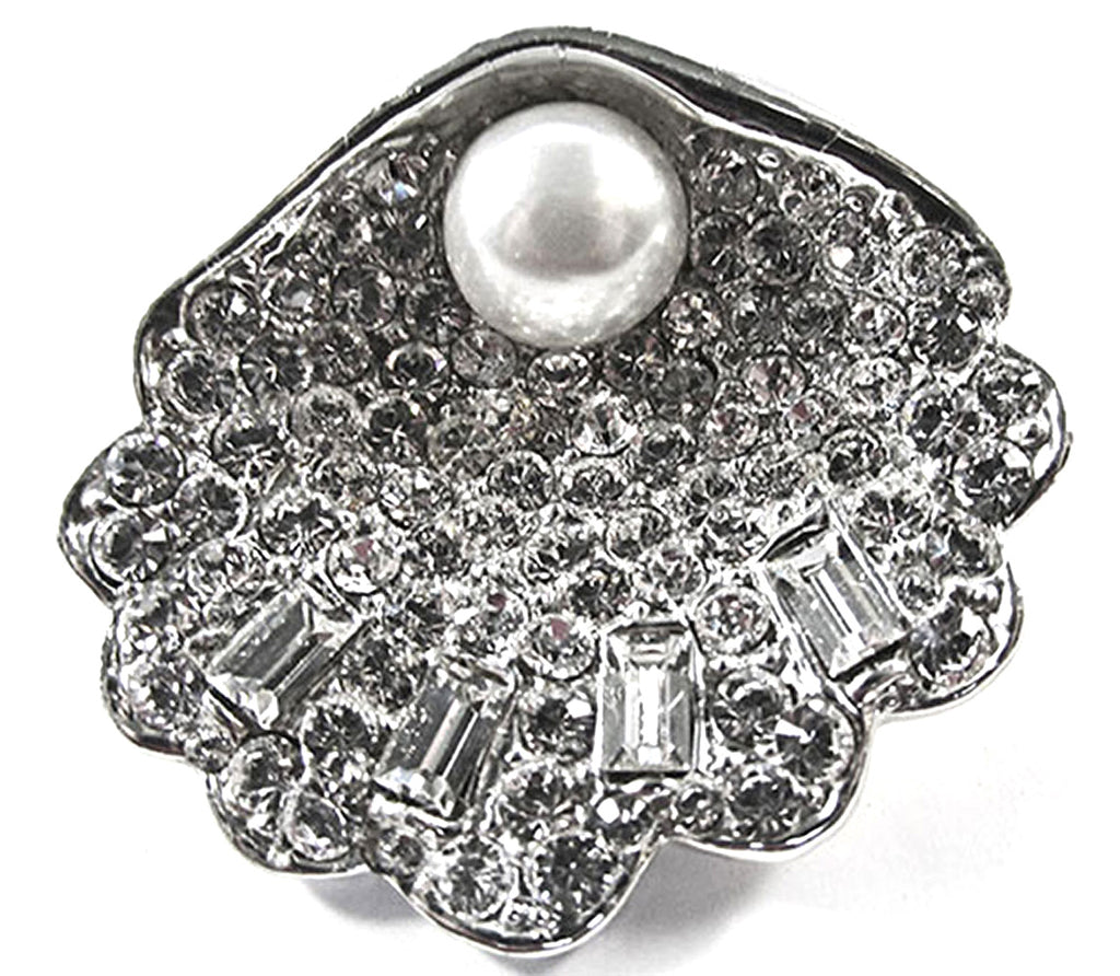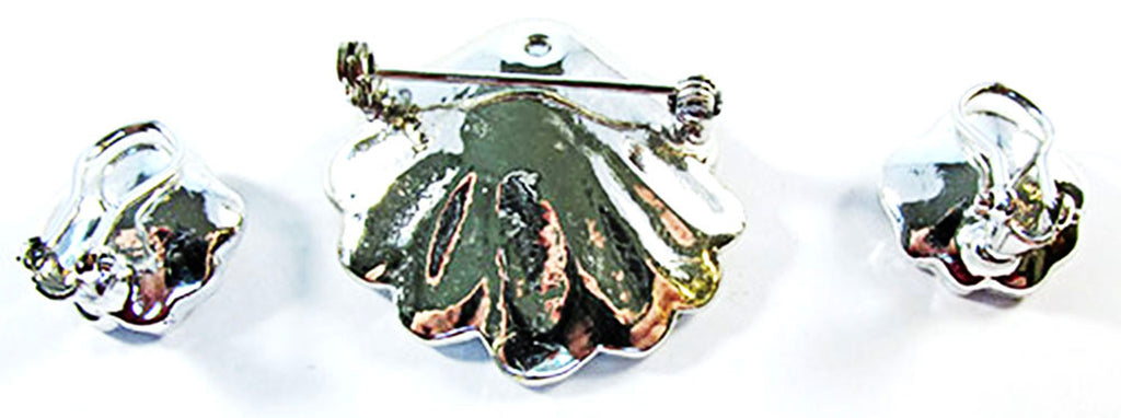 Discover a rare mid-century treasure that demands to be worn. This 1960s seashell-motif ensemble pairs a commanding pin with matching clip-on earrings, with ivory-colored faux pearls and dazzling clear rhinestones all rendered in lustrous rhodium-plated silver settings. The pin's secure roll-over closure and generous 1½-inch by 1¼-inch presence make an undeniable statement, while the coordinating ¾-inch by 3/4-inch clip-on earrings offer flexibility—wear them solo for subtle sophistication or together for show-stopping impact. Unsigned yet unmistakably designer-caliber, this collectible set remains in immaculate condition, its masterful craftsmanship evident in every sparkling detail. Whether you're seeking that perfect vintage accent or building a curated collection, this versatile pairing delivers the polished glamour and distinctive character that transforms an ordinary day into an occasion. Own a piece of mid-century elegance that speaks for itself.