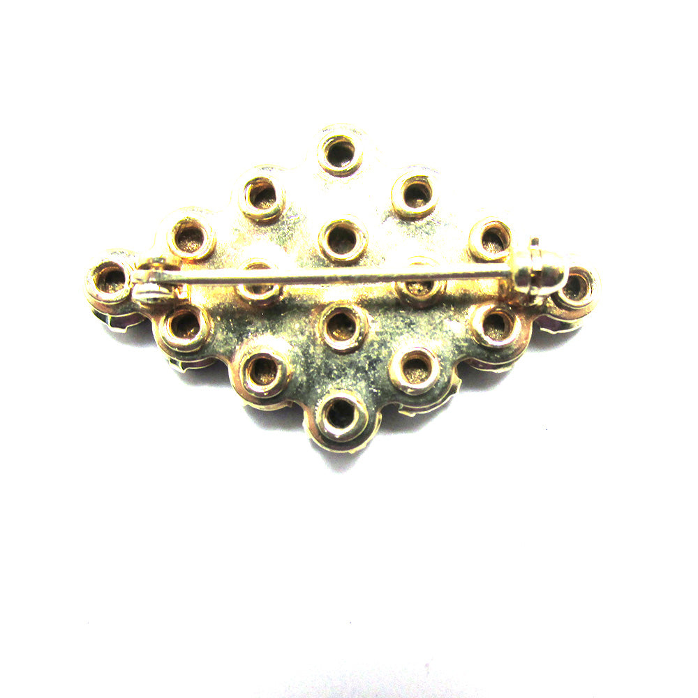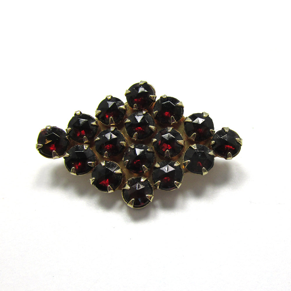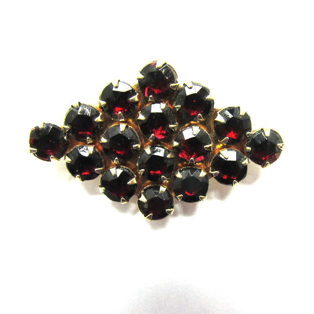 Exquisite mid-century diamond-shaped geometric pin featuring garnet-red rhinestones meticulously prong-set in a gold setting. This pristine 1950s piece measures 7/8-inch x 1-1/4 inches with a secure roll-over safety closure. Though unsigned, its exceptional craftsmanship and immaculate condition reflect high-caliber quality. A sophisticated addition to any collection or an impressive gift for the discerning vintage enthusiast.