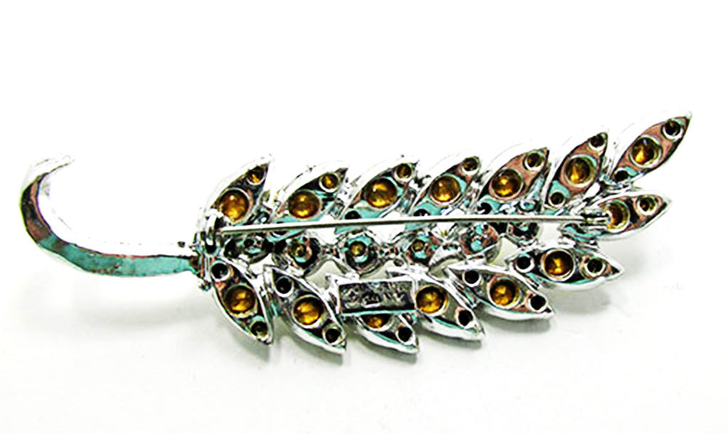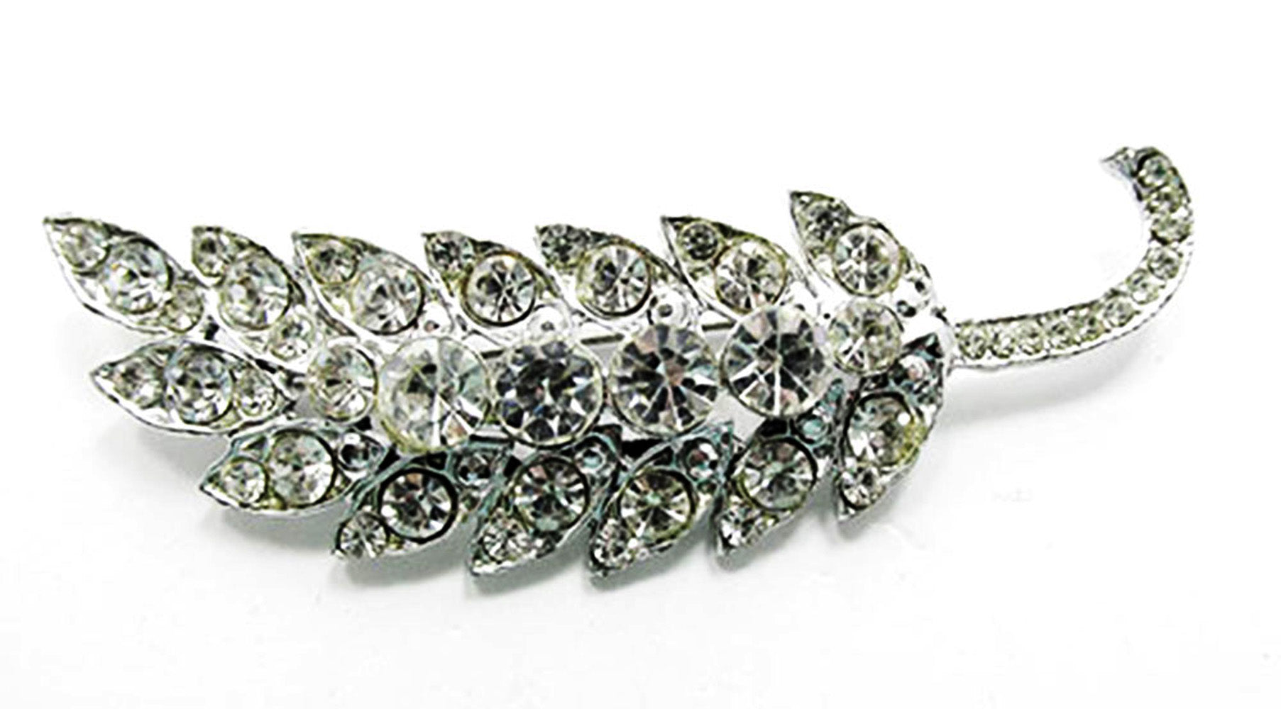 This vintage 1950s dramatic rhinestone floral spray pin by H. Pomerantz & Co. NY exemplifies mid-century design excellence. Featuring clear rhinestones set in a silver-toned, rhodium-plated setting, the pin measures 4 inches tall by 1¼ inches wide with a roll-over safety closure. Known for its bold craftsmanship and superior quality, this rare collectible remains in exceptional condition with no missing or damaged stones and no wear to the setting. Ideal for collectors and connoisseurs, it offers a distinguished statement piece and a refined gift for special occasions.