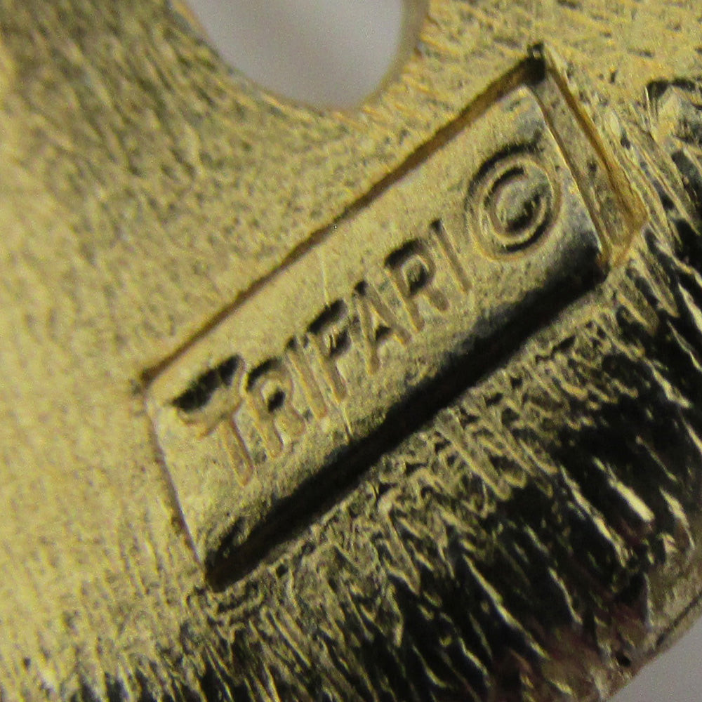 This authentic 1950s Crown Trifari gold pin exemplifies mid-century craftsmanship with its meticulously designed floral motif. Measuring precisely 2 inches x 2 inches, this signed piece features the characteristic roll-over safety closure typical of premium vintage brooches. The pin remains in perfect condition—no setting wear is evident, maintaining its original luster and structural integrity. A quintessential example of Trifari's renowned design aesthetic, this versatile accessory represents a significant addition to any curated vintage jewelry collection.