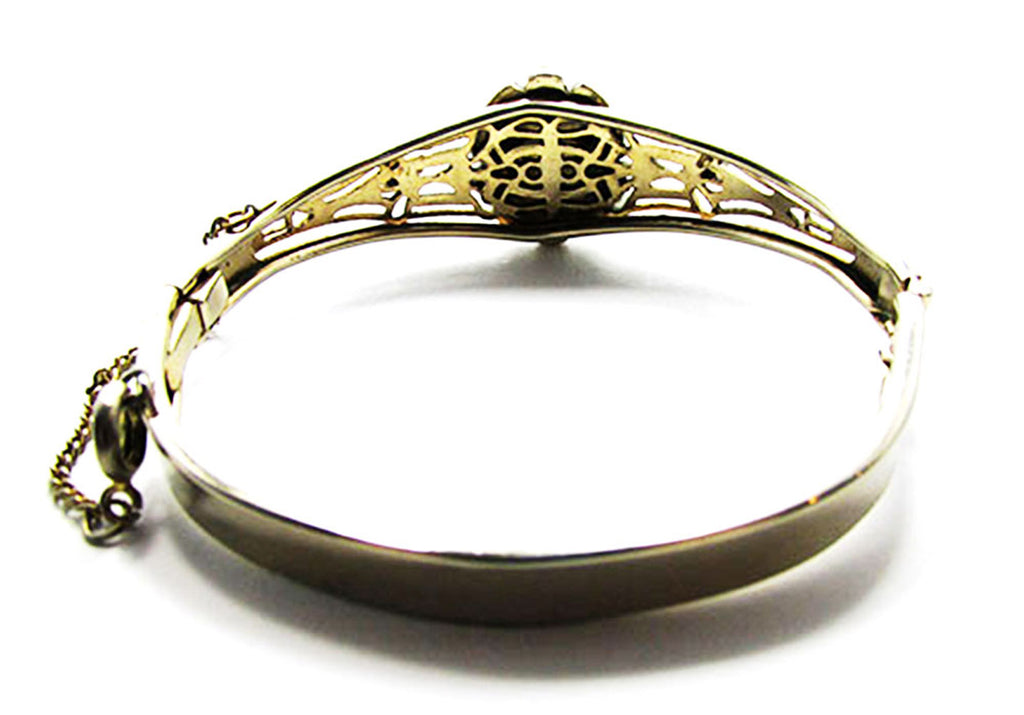 This stunning 1940s Edwardian-style cuff bracelet features a striking faux carnelian cabochon surrounded by delicate ivory faux pearls all set in a radiant gold toned frame. With a comfortable 7-inch inner circumference, secure push-in closure, and safety chain, it combines elegance with practicality. Crafted with flawless design and exceptional quality, this vintage piece is in perfect condition—no chips, damage, or wear. A timeless treasure, it makes an unforgettable gift for birthdays, anniversaries, or any special occasion, and a beautiful addition that would elevate any jewelry collection.