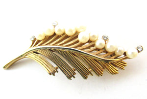 Vintage 1960s Crown Trifari Designer Diamante and Pearl Leaf Pin