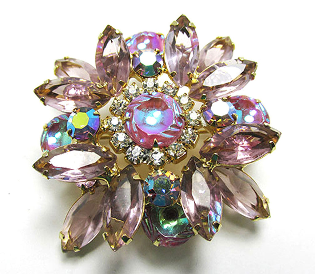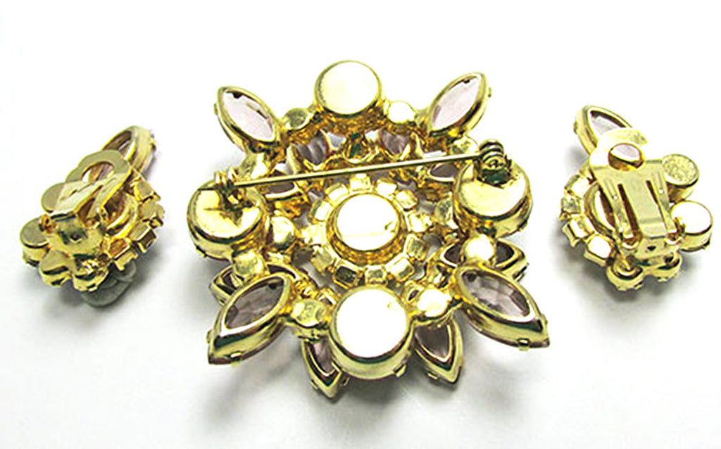 Add a splash of vintage glamour with this dazzling 1950s pin and earring set. Featuring pink molded stones alongside pink, clear, and iridescent aurora borealis rhinestones in a gold-toned setting, these bold pieces shine with exciting design and high-end quality. The 2-inch pin secures with a roll-over safety closure, while the 1¼ by 7/8-inch clip-on earrings offer versatile wear—together or solo. In pristine condition, with no missing stones or wear, this set is sure to make your friends envious and elevate any outfit with playful sophistication.